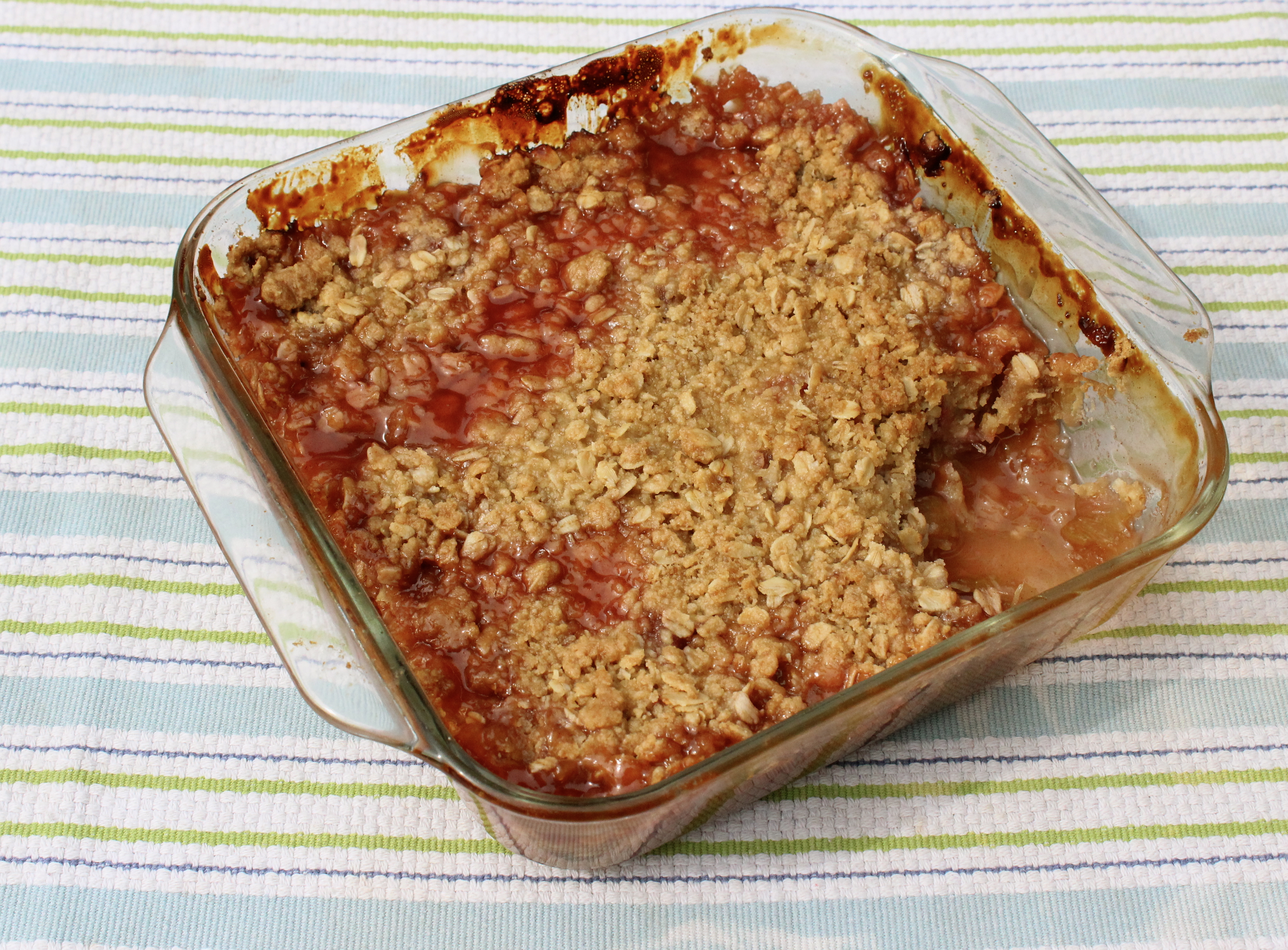 - Tip the rhubarb mixture into an 8 by 8-inch pyrex dish. Top the rhubarb with the crumble mixture so that the rhubarb is completely covered. Bake 1 hour, until bubbling and browned on top. Let the crumble sit for at least 15 minutes before serving. Serve warm or at room temperature topped with the ice cream of your choice.