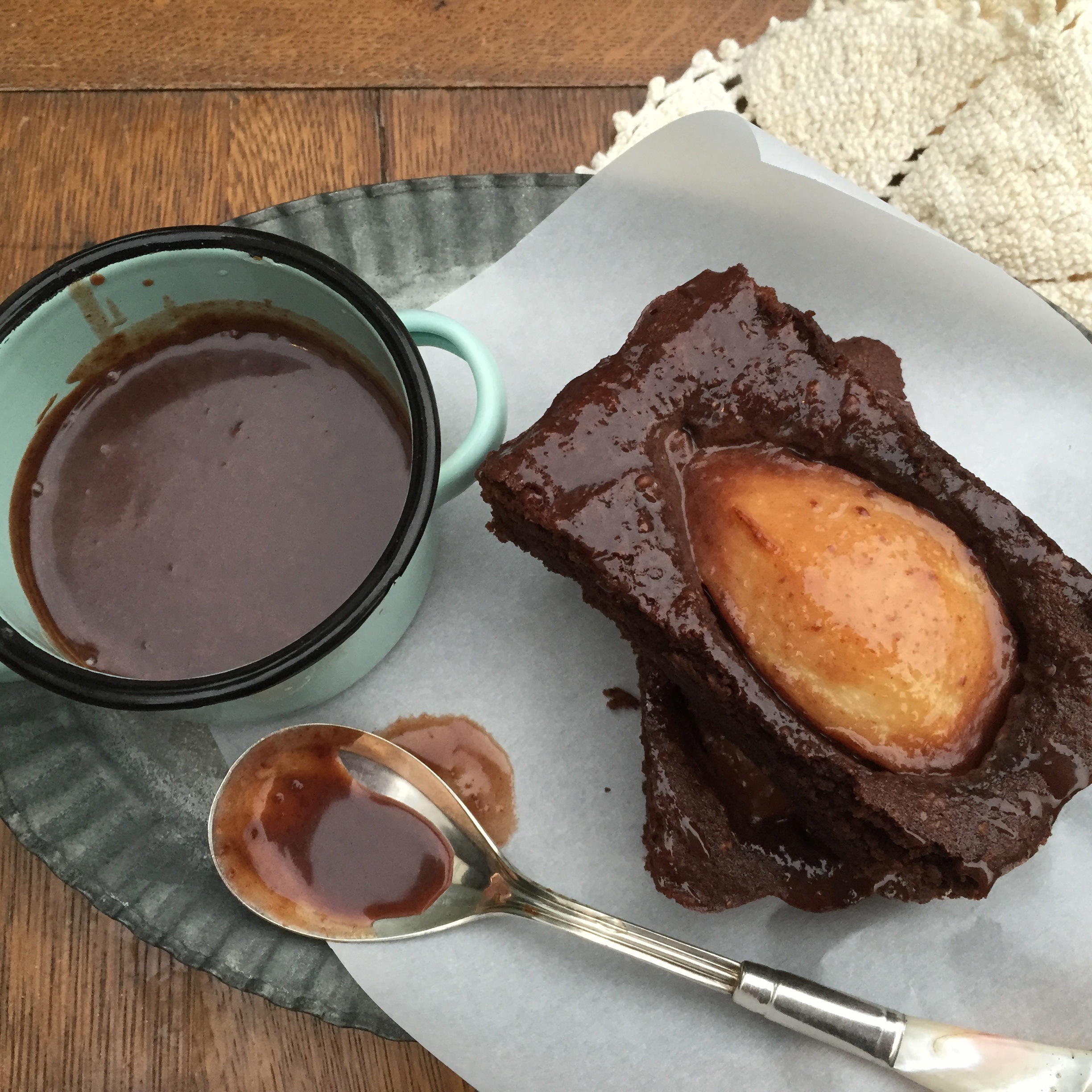 - Peel, core and quarter the pears. Press the pear quarters into the chocolate batter at even intervals. Bake the tart for 40 to 45 minutes, until the sides of the tart can be gently and cleanly pulled away from the tin.
